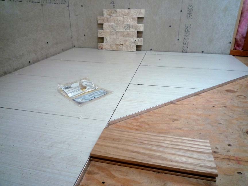 This image shows the tile work that is going to be underneath and behind the wood stove. In the foreground is a small piece of the oak flooring that will meet the tile floor.