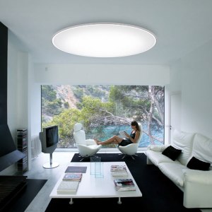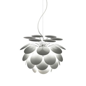 This fixture is called “Big Ceiling Light” appropriately enough. The design is by Lievore, Altherr and Molina. Made in Spain by Vibia. It’s available in two sizes: 39.5″  and 47.25″ Diameter. I would guess this is the bigger one in the image.