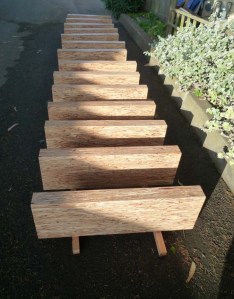 This is a jig that I made to align the stair treads during the assembly process. The steel frame intentionally has a lot of room for adjustment to allow for irregularities in the floor and the walls and any variation in all the parts involved. These treads are screwed into the steel plate from below. See the steel plates here and to see the steel frame going in go here.