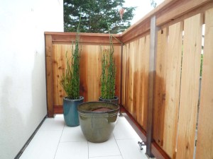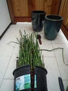 So here is my terrace with 2 tall pots of equasedum from Home Depot and a new pot waiting for my “special” bamboo from Oregon.