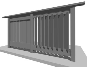 I started watching the sun set over my new deck over the last several months. During certain months the sun will be coming right onto my deck and into my new living room. I wanted to take advantage of that. I didn’t, however, want to see or be seen by my neighbors. I developed an angle that I hope will allow for me to look out toward the ocean but will block my view to the neighbor’s house. Different sections of the railing will have different designs. Some designed for letting light through and others to block visibility as much as possible. I learned a lot from the first fence that I built for the ground level. I learned to base everything on stock lumber that I can easily get nearby. Look at fence design on verb2. The railing should relate to the fence below but the requirements are a little different.  Here is a rendering of the railing concept :