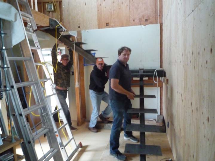 • The stairs are in process. The metal frame is in place but I still need to level everything and make the final connections to the building. There will be plenty of work to do here. The engineer specified a beam under the floor where the stairs hit the lower level. The treds are wood and need to be cut and attached, then metal verticals are attached to each tred and those are topped with a solid wood handrail.