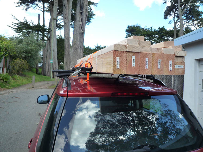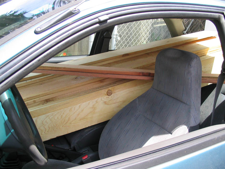 I had a smaller car and no roof rack. It just goes to show you that you do not need a huge truck to get lumber home to your project.