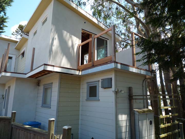 This house was built with older growth redwood before our better understanding of sustainability. My respect for those trees is shown by keeping it in place rather than tossing it in a dumpster. The patch shown here is actually pine from New Zealand. Of course there are issues with shipping the material so far but there is apparently enough of a market for it that it makes some sense. My contractor used redwood which is usually well controlled to be sustainable these days. When examining the new redwood compared to the older redwood, you can certainly see a big difference in the tightness of the rings and the weight of the wood and even the darkness of the color.